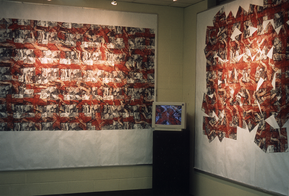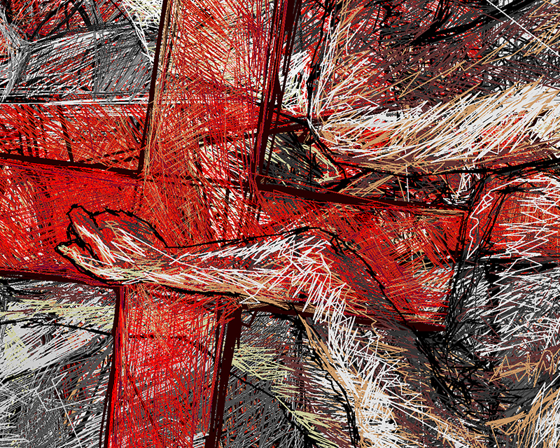 electronic art exhibition, Die Installation besteht aus zwei Bildfeldern und einem Automatischen Zeichner. Die Bilder links sind nach dem negativen grauen Kreuz und die rechts nach dem positiven roten Kreuz ausgerichtet. Zwischen beiden Kreuzen rotieren in der Animation menschliche Figuren. |
